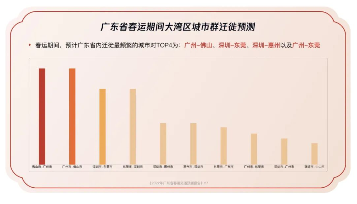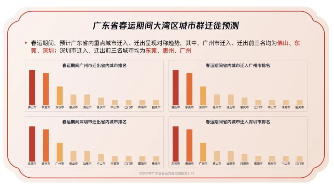 城市方面,预计大湾区城市群迁徙最频繁的城市对前4为:广州-佛山、深圳-东莞、深圳-惠州以及广州-东莞。