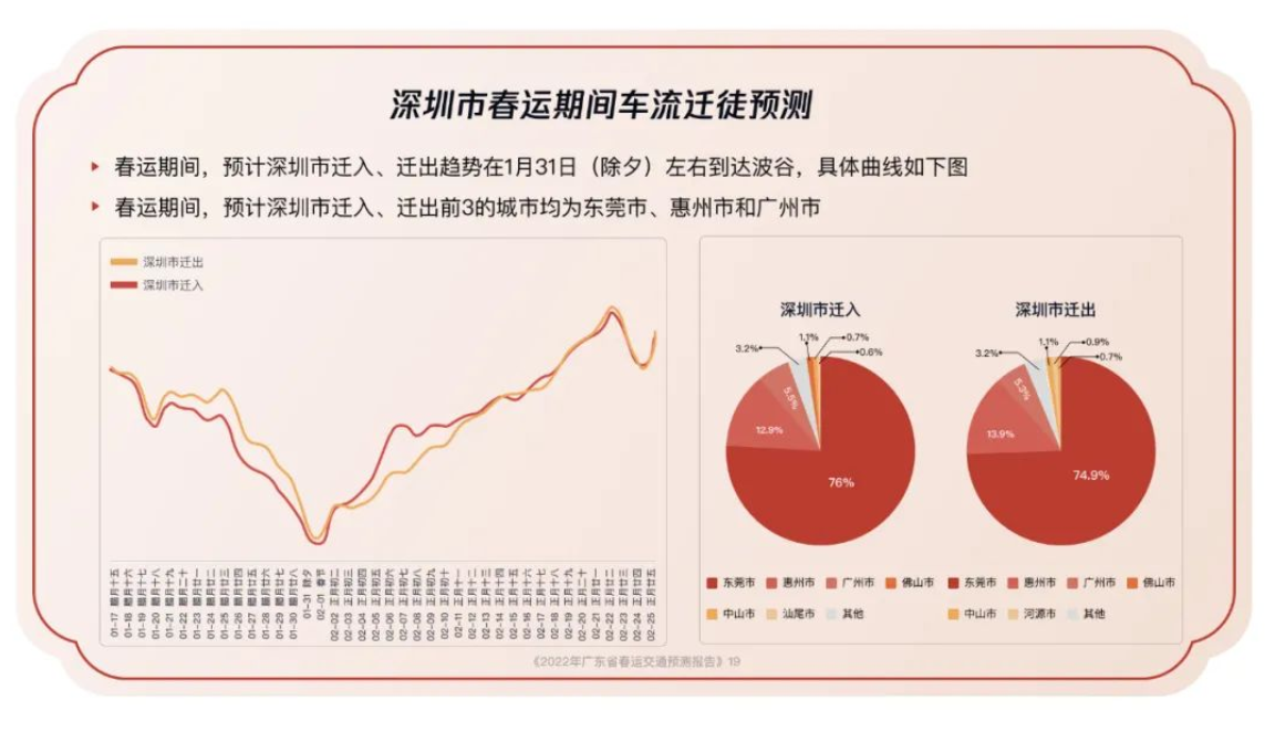 深圳市春运期间车流迁入、迁出趋势将在1月31日(除夕)左右到达波谷;迁入、迁出前3城市均为东莞市、惠州市和广州市。