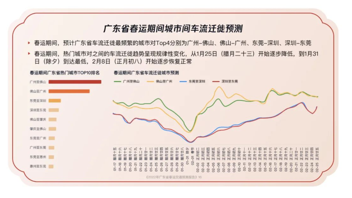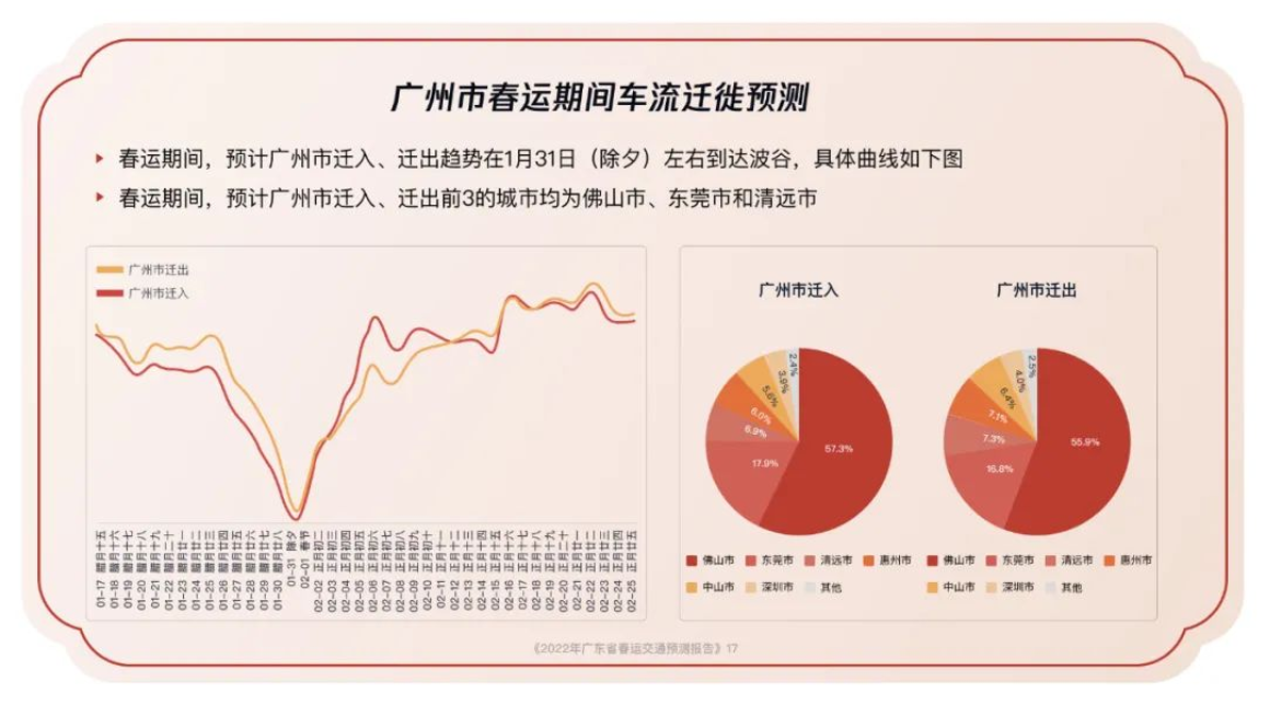 广州市春运期间车流迁徙预测表明,迁入、迁出趋势将在1月31日(除夕)左右到达波谷;迁入、迁出前3的城市均为佛山市、东莞市和清远市。