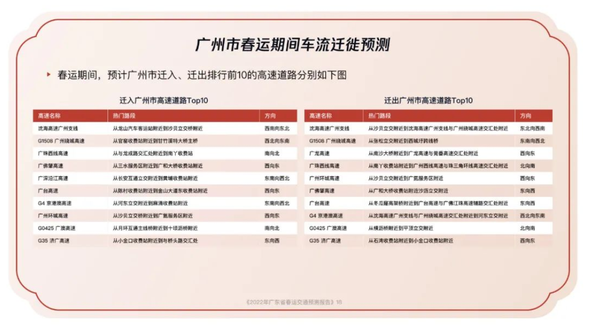 预计春运期间广州市迁入、迁出排行前10的高速道路分别如下图: