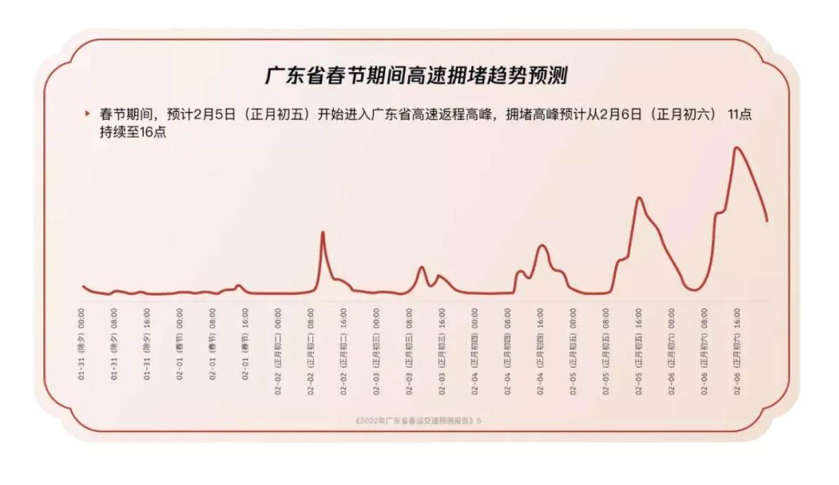 春节期间,预计2月5日(正月初五)开始提前进入高速返程高峰,拥堵高峰预计将从2月6日(正月初六)11点持续至16点。