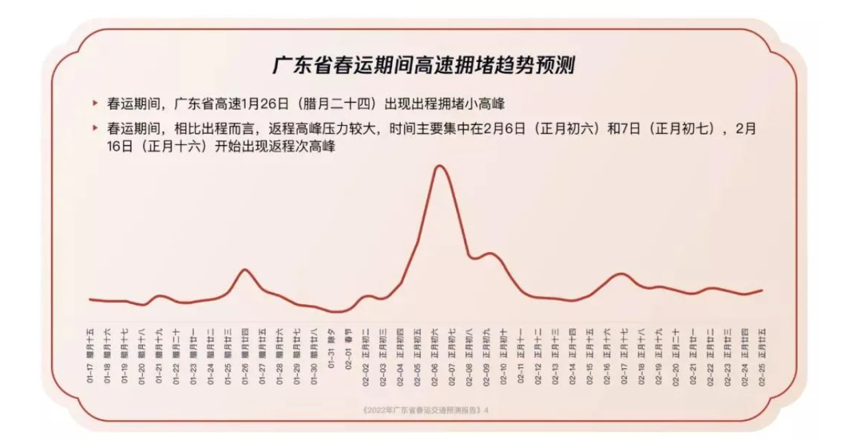 根据《预测报告》显示,春运期间,高速出程在1月26日开始出现拥堵小高峰;相比出程而言,返程高峰压力较大,时间主要集中在2月6日(正月初六)和7日(正月初七),2月16日(正月十六)开始出现返程次高峰。