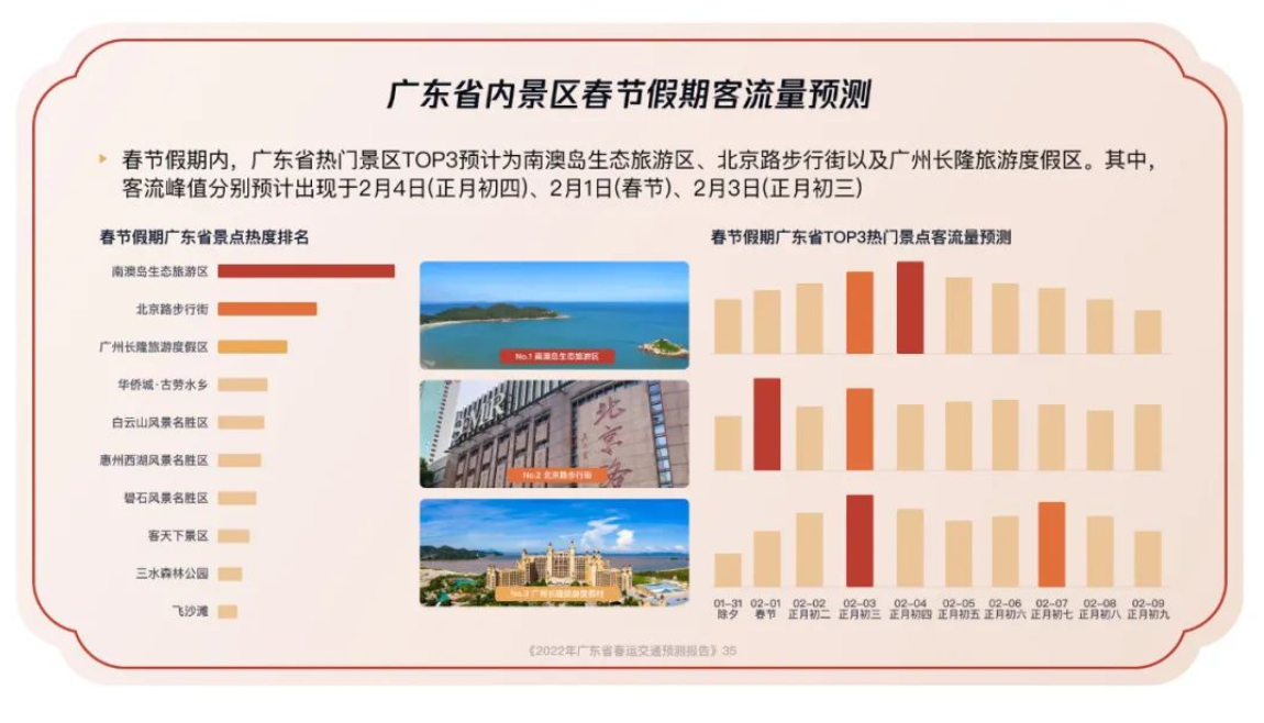 省内热门景区前3预计为南澳岛生态旅游区、北京路步行街以及广州长隆旅游度假区。客流峰值分别将出现于2月4日(正月初四)、2月1日(春节)、2月3日(正月初三)。