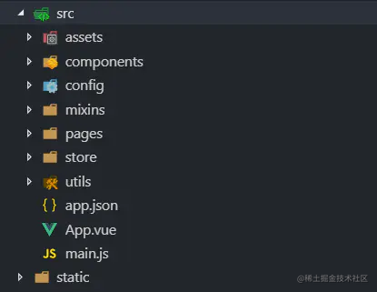 接着,完善文件结构,增加 config、store、mixins等模块,如图:
