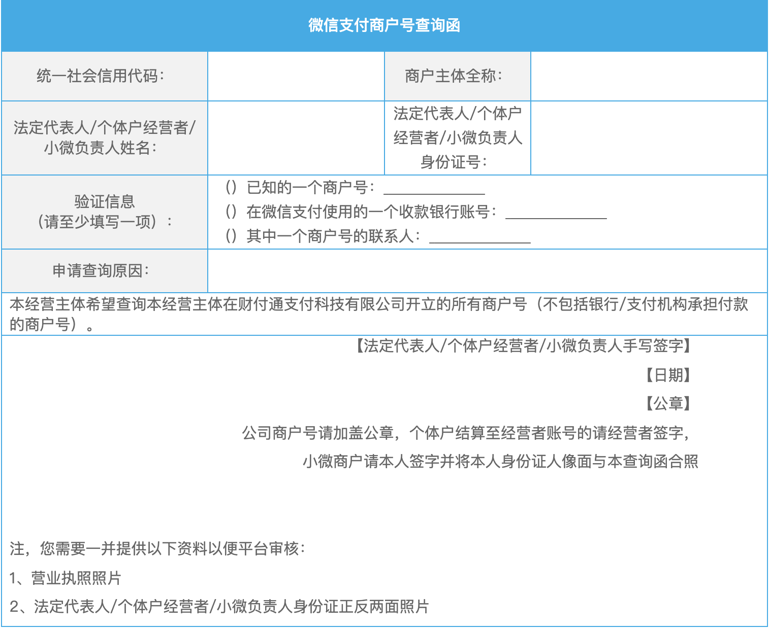 若以上方法仍无法查询到商户号,可参照以下格式打印查询函,登录QQ后点击这里提交