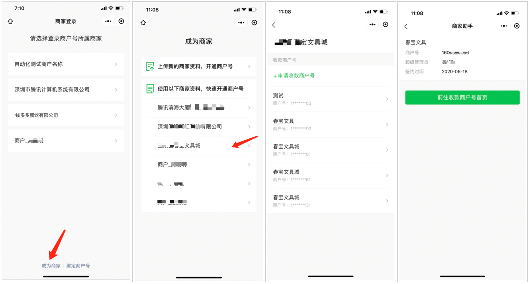3、若该主体下已有其他商户号,可由对应商户号的超级管理员进入微信,打开“微信支付商家助手”小程序->在登录页底部点击“成为商家”->选择需查询的商家名称->进入查看即可
