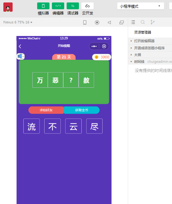 做成语答题小程序已近有一段时间了,其中遇到了很多bug,经过不断修复不断完善,并根据部分网友的建议,完善了成语答题小程序2.0版本。
