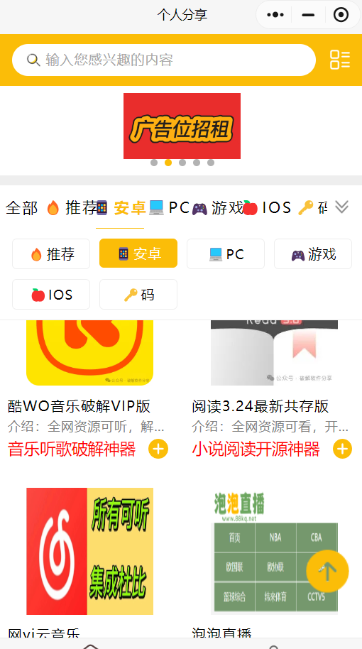 首页最上面,一个搜索框,支持搜索全部资源,然后有一个轮播图,可以打广然后推荐资源啥的,紧接着可以有一个列表分类,比如:软件,游戏,资源等等,下面就是具体的资源了,名称+简介!