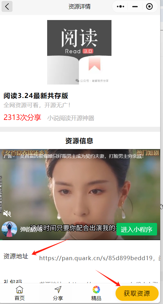 接下来就是详情页面的,放上资源地址,一键获取即可,整个小程序就链路打通了!