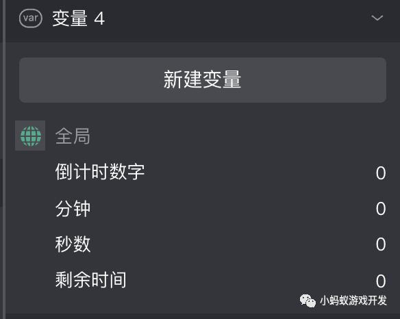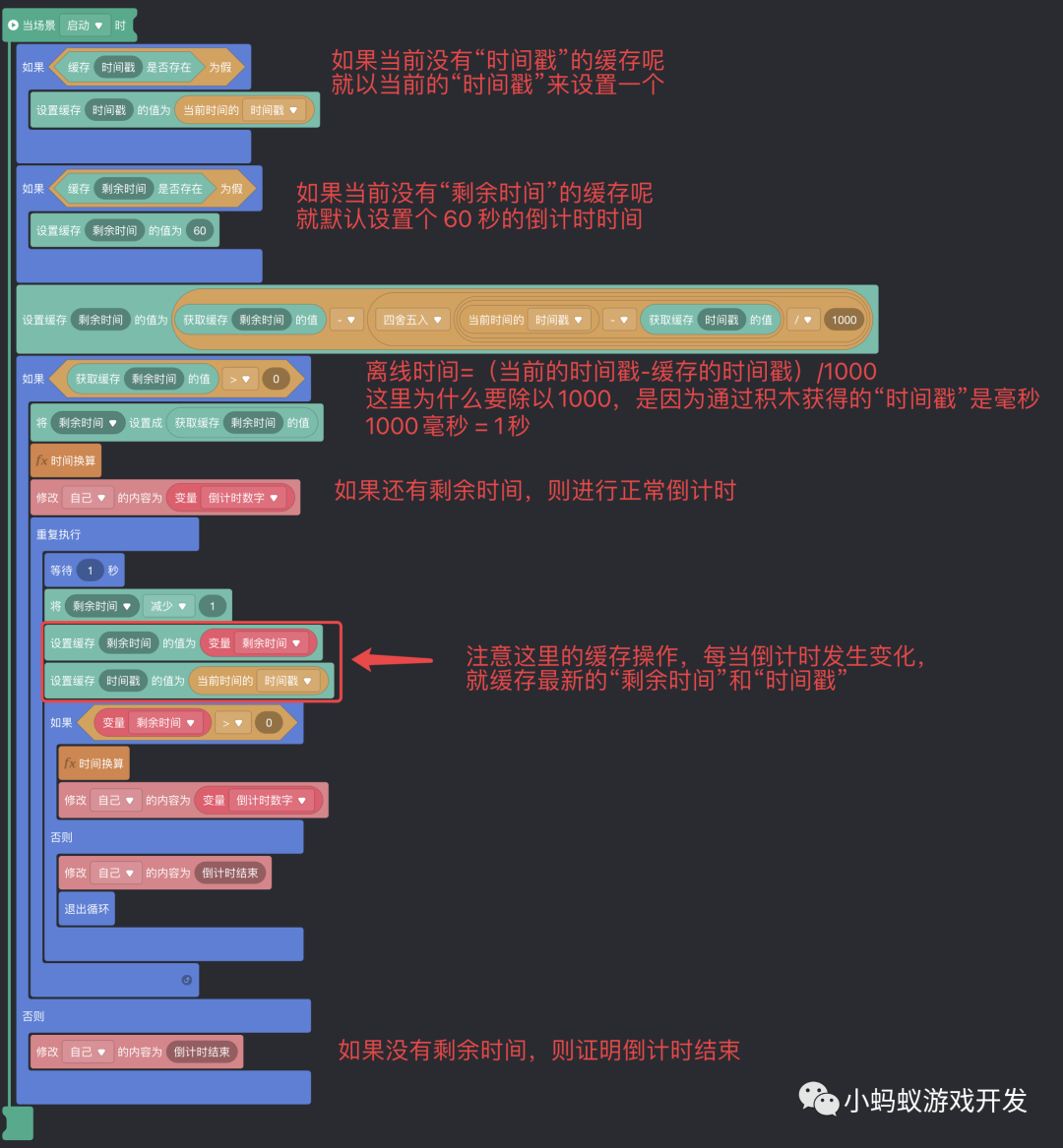 这里需要注意的一点儿就是倒计时中新增的两块缓存积木,每当“剩余时间”发生变化时,我们都将最新的“剩余时间”和“时间戳”进行缓存。这样,不论何时玩家退出游戏,或者是进入到游戏的其他场景,缓存中的“剩余时间”和“时间戳”记录的都是最后的那一刻。