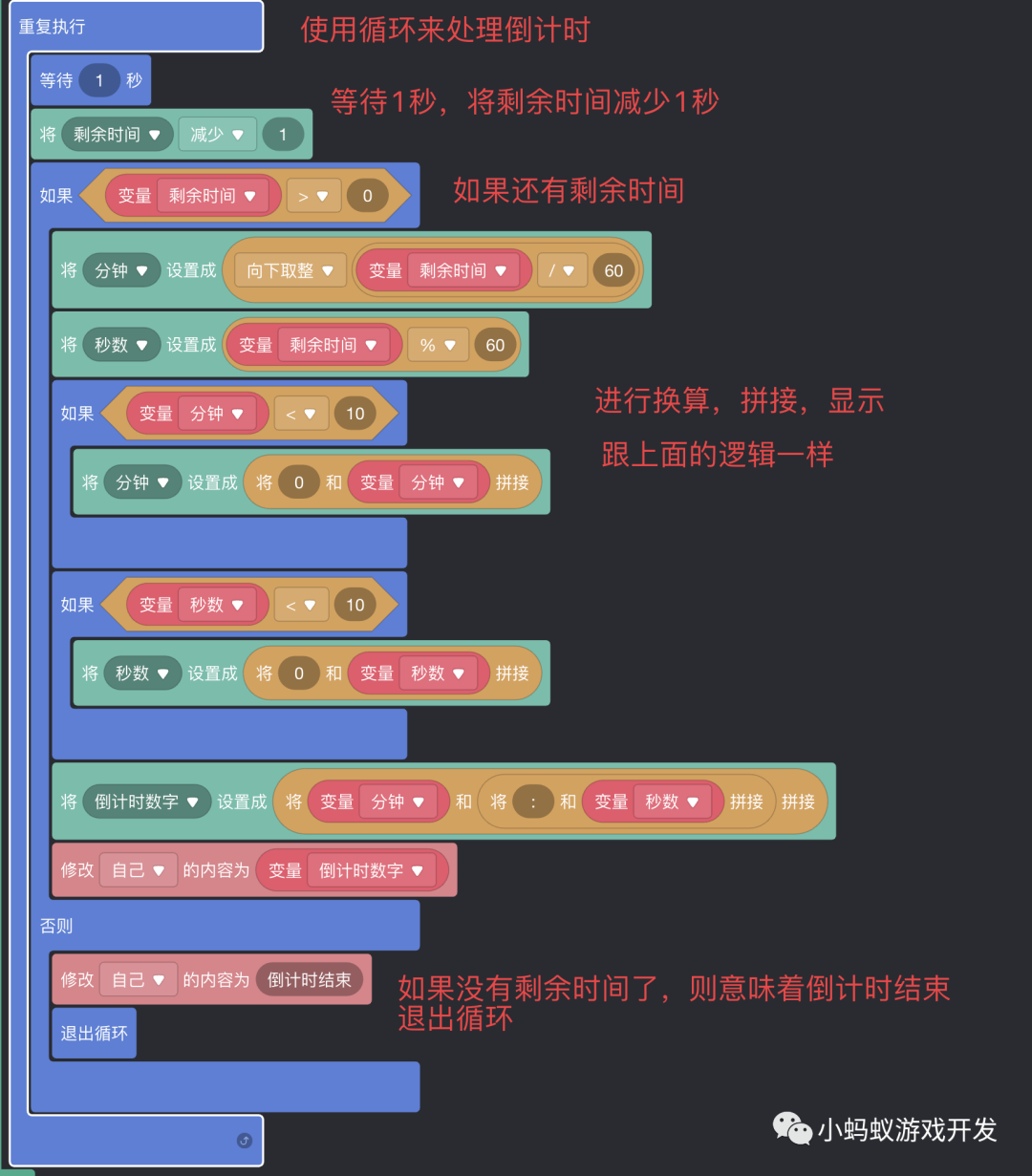 我们使用了一个“重复执行”积木来处理跑动的倒计时,然后使用了一个“等待 1 秒”积木块实现了每间隔 1 秒去进行一次处理。至于时间的换算和显示则跟上方一样,如果还有剩余时间,则每隔 1 秒,处理显示一次。如果没有剩余时间了,则倒计时结束,退出循环。