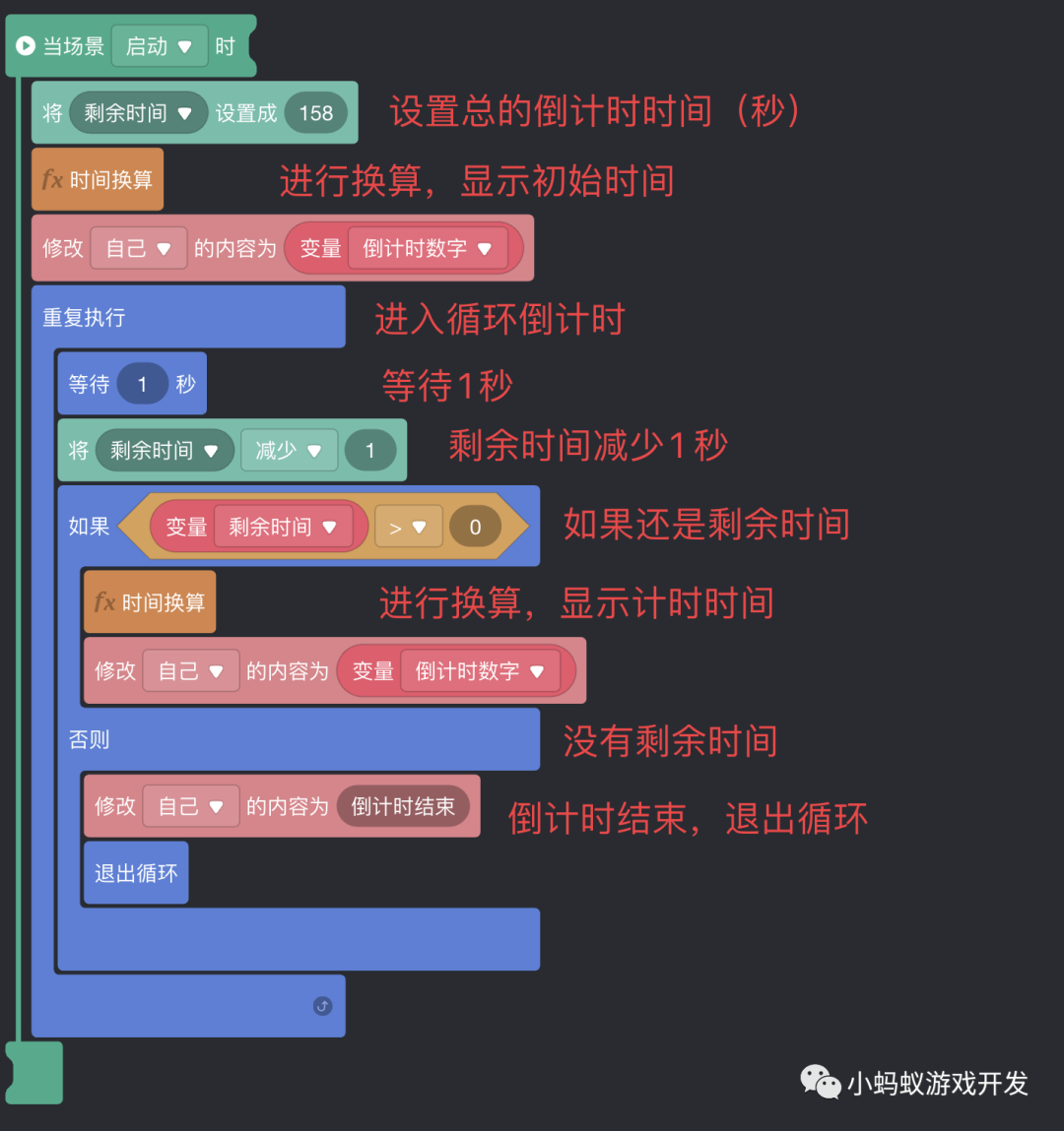 积木逻辑并不复杂,设置了倒计时的总时间 158 秒,计算出对应的分钟数和秒数,使用拼接积木将分钟数和秒数拼接起来,最终显示在文本上。