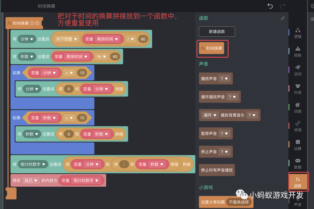 我们创建一个“时间换算”的函数,然后把这部分可以复用的积木块放到函数中。