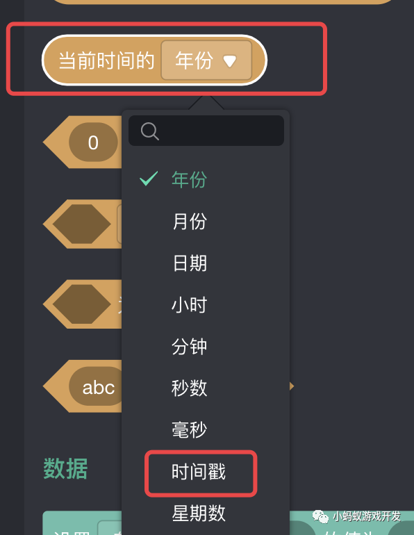 接着,找到获取“时间戳”的积木块,它位于“计算”类别中的“当前时间的XX”积木块中,点击下拉,可选中获得“时间戳”。
