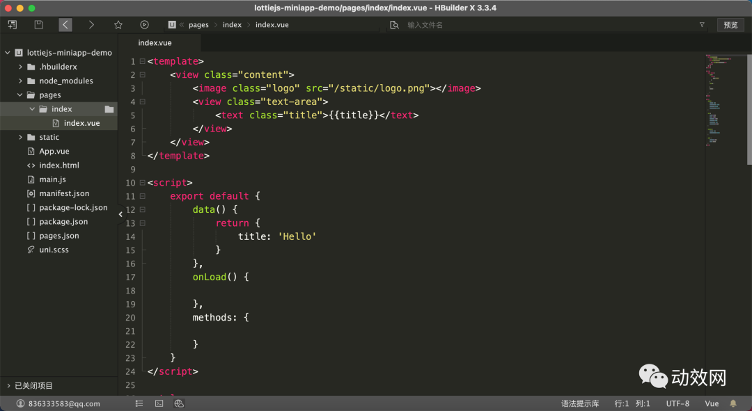 使用 uni-app 开发微信小程序,基于 lottiejs-miniapp 实现 Lottie 动画的播放。