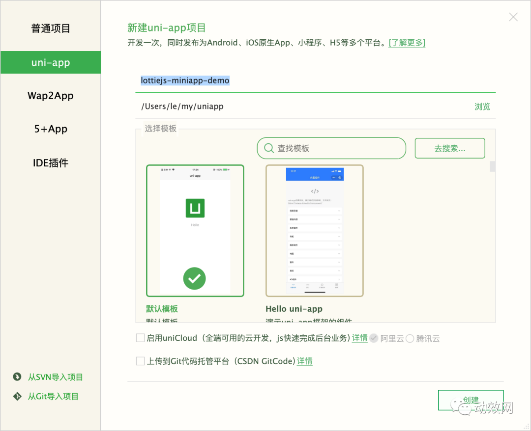 第一,打开 HBuilderX 工具,新建一个 lottiejs-miniapp-demo 项目: