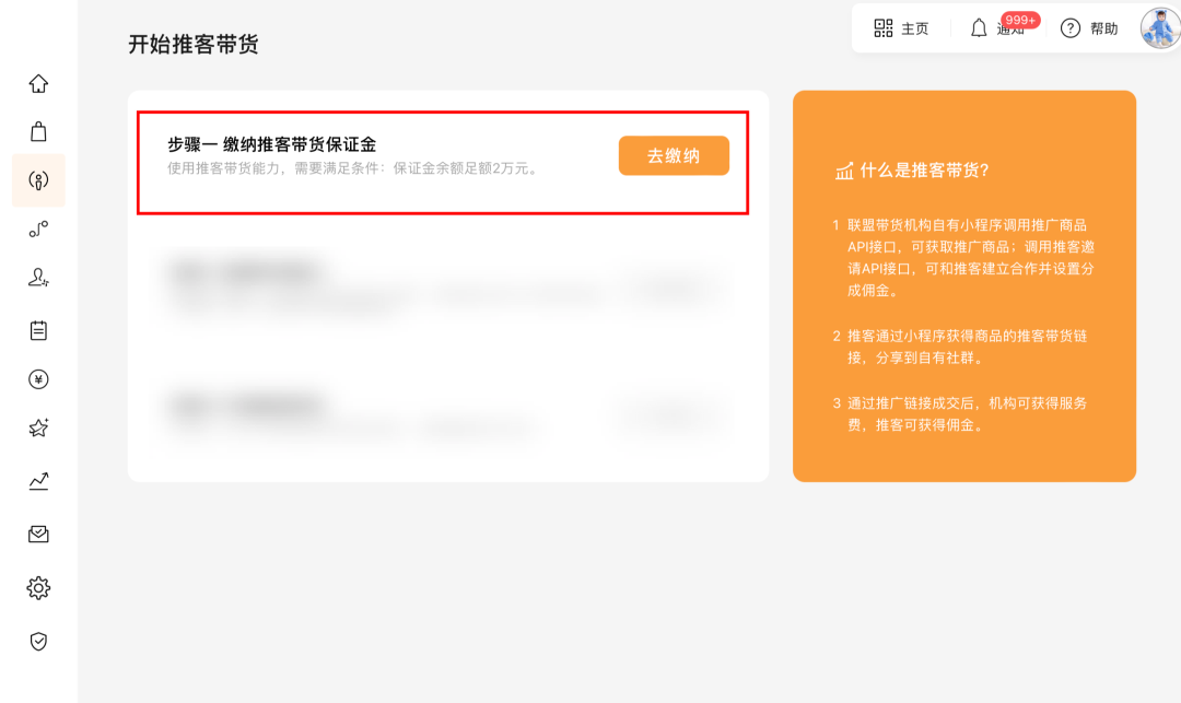 第一步:机构登录联盟带货机构管理平台,完成推客带货保证金缴纳,路径:打开【推客带货】-缴纳推客带货保证金-点击「去缴纳」。