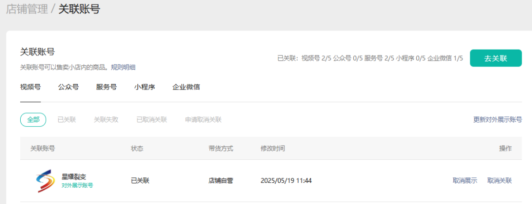 在微信小店后台「店铺管理-关联账号-去关联」关联视频号,被关联的视频号可通过直播、短视频带小店的商品,还可以关联公众号、服务号、小程序、企业微信。