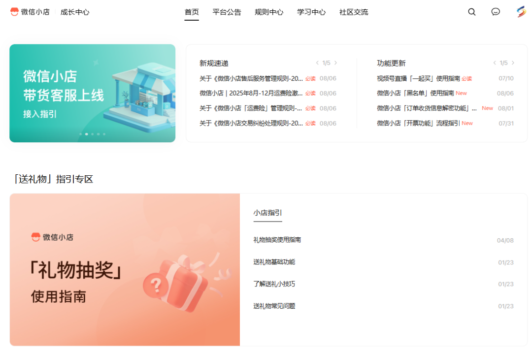 百度搜索微信小店,进入官网,点击左下方「成长中心」,即可查询新归速递、功能更新、案例库、行业攻略。