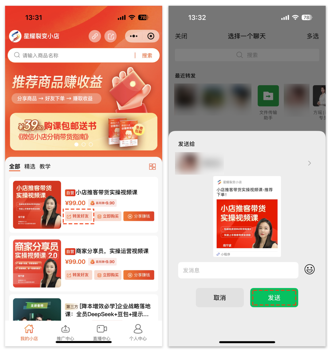 推客进入推客小程序,分享商品二维码海报、商品口令,也可以分享直播预约二维码、直播间、挂车短视频到社群、私聊或朋友圈里带货。