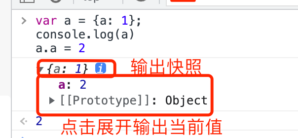 - 在使用 console.log 打印一个 Object 时,直接显示的是对象在调用 console.log 时的快照。