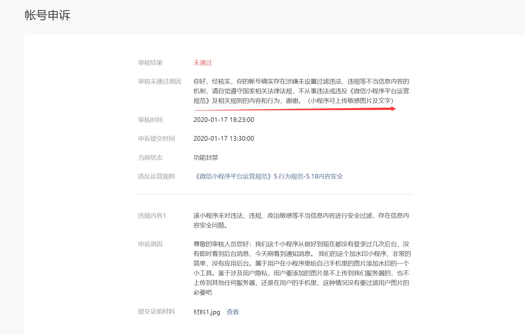 申诉后,申诉失败,我想说用户的图片即没有上传腾讯服务器,也没有上传我们的服务器,也没有上传其他任何服务器,也发布不到任何地方,不算是上传吧??