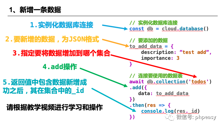 本小节开始,我们将学习云函数如何操作数据库,现在我们开始学习如何向云数据库中新增一条数据。