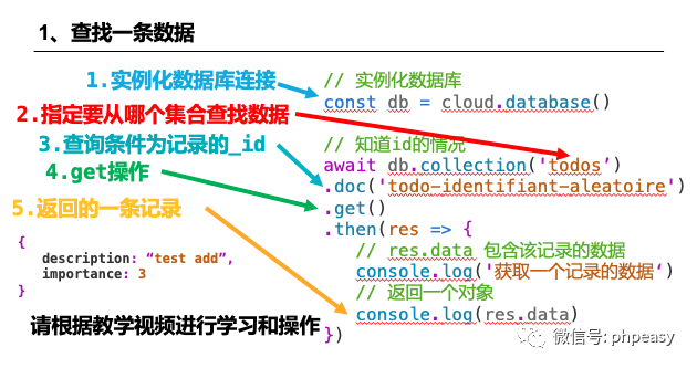 第五步,操作成功后,返回值res.data中包含了多条记录,请注意,这是一个数据,该数据中包含多个对象。大家需要注意查找多条数据和单条数据在返回值的区别,所以,我们建议大家都使用查找多条数据方法,如果要查找单条数据,只需要在查询条件的代码里,增加一个_id字段即可。