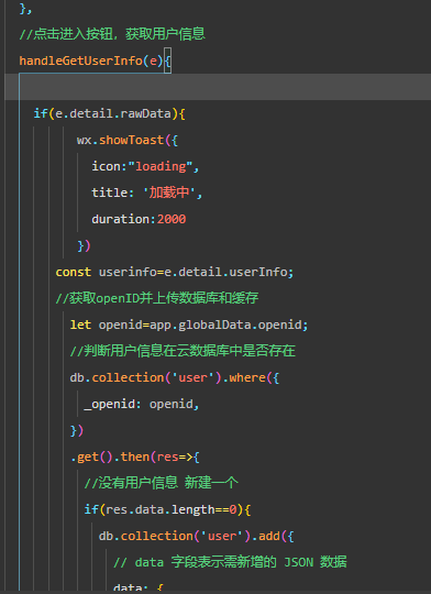 - 在start页面中点击进入,对用户openid是否在数据库中进行判断,并做出相应做法。