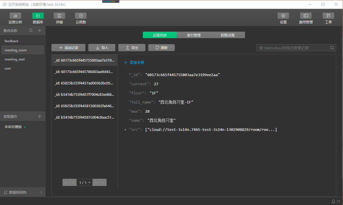 2.利用云数据库存储自习室信息、座位信息、用户信息、意见反馈信息
