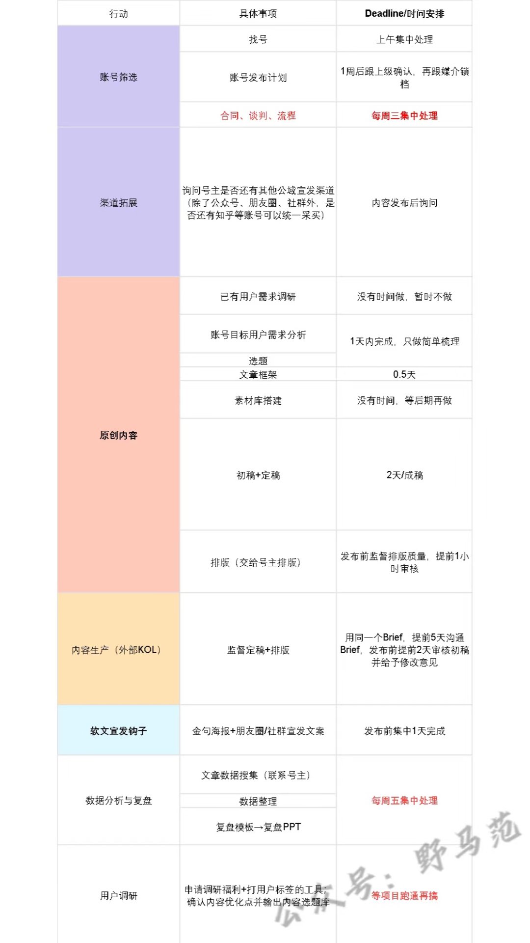 这个时候呢,摆在你桌面上的工作就可能有这些:账号筛选、渠道拓展,原创内容、联系KOL和媒介,你可能还要做软文投放的钩子设计,与之伴随着还要同时去做数据分析和复盘,可能会感觉到非常手忙脚乱,于是某只运营狗的工作日程可能是像下面这张表这样子的:
