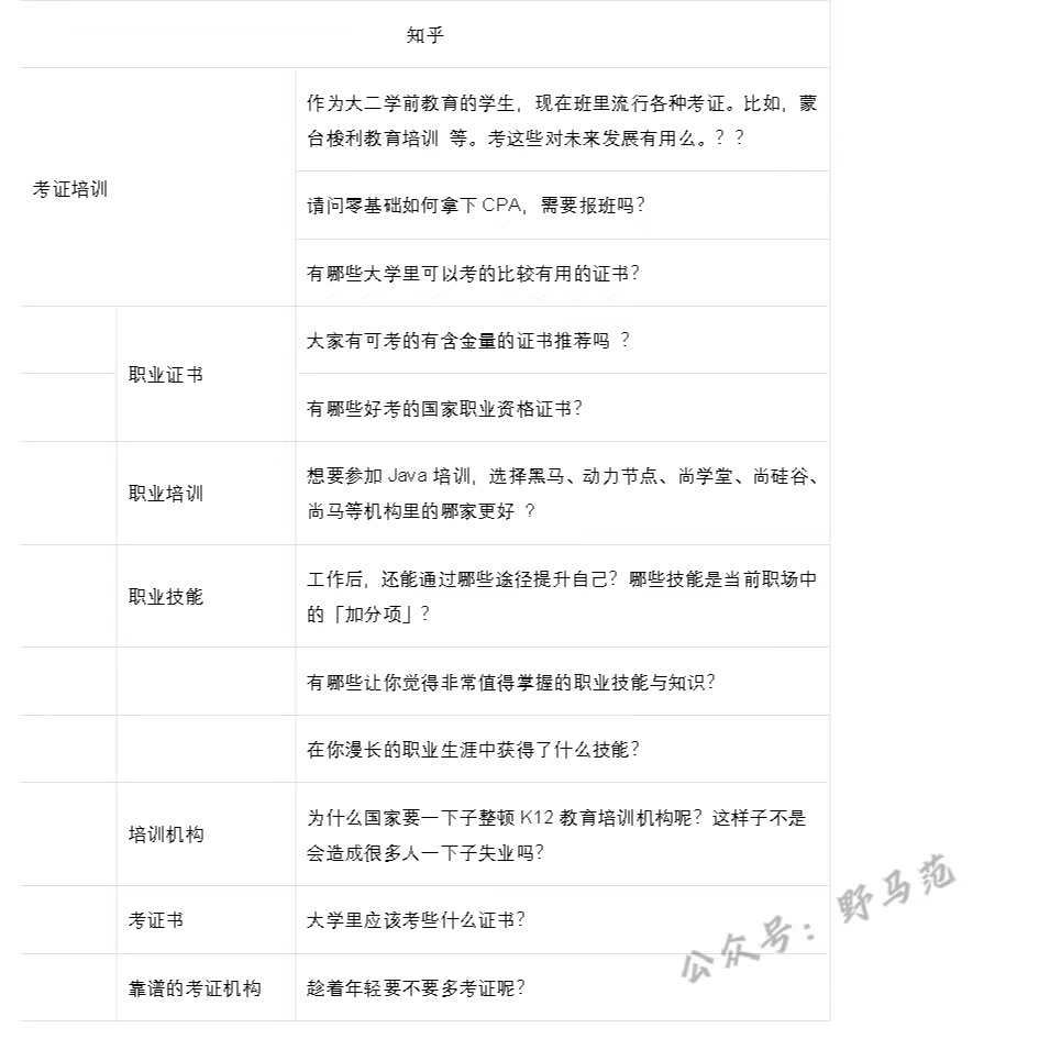 除了【核心词和拓展词】内容库,还需要积累的是:竞品话题库、自研内容话题库、各大平台热门话题库,比如知乎的热门话题内容库里面,知乎平台的用户对于【考证培训产品】的需求就可以细分为【职业证书、职业培训、职业技能、培训机构、考证书、靠谱的考证机构】等等,如下图: