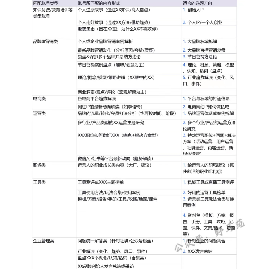 还可以根据账号类型,研究他们的内容形式,再由此发散选题方向,最后从选题库里面筛选出合适文章投放,参考如下: