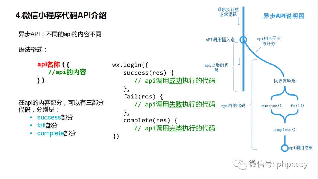 那么我们应该如何避免呢?下面我们就来介绍一下异步api的基本结构,因为在本项目中,我们使用到的全部都是异步api,因此,另外两种的细节我们不做过多介绍了,想学习的同学可以通过微信开发者文档进行学习。如右图所示,就是刚才我们讲的异步api执行过程。