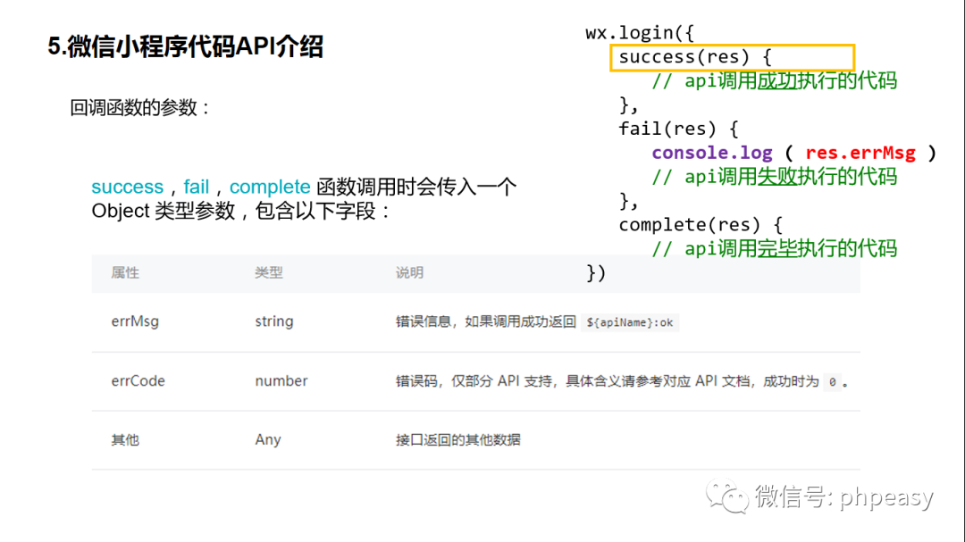 我们已经知道这三部分分别在api调用成功、失败和完成时执行,但是我们是不是还应该知道一些具体信息呢?比如调用失败,如果可以知道失败原因,是不是就可以继续编写代码解决这个问题呢,比如重试一次。这就是我们使用这个参数的意义。通常这个参数中会包含两部分,一个是错误信息,其属性为errmsg,类型为string,另一个是errcode,类型为number,代表错误码。如果成功,那么这两部分则分别为ok和0。此外,这个参数中还可能包含一些其他信息,比如网络请求的api,获取用户身份信息的api,在成功时要能够看到请求到的数据,那么也会通过这个参数来传递。