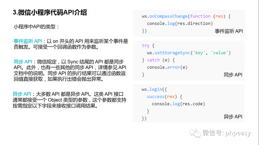 - 同步API 微信规定,以 Sync 结尾的 API 都是同步API,比如在处理存储方面的api,但是并不绝对,此外还有一些api也是同步的,详情参见API文档中的说明。同步API 的执行结果可以通过函数返回值直接获取,如果执行出错会抛出异常。