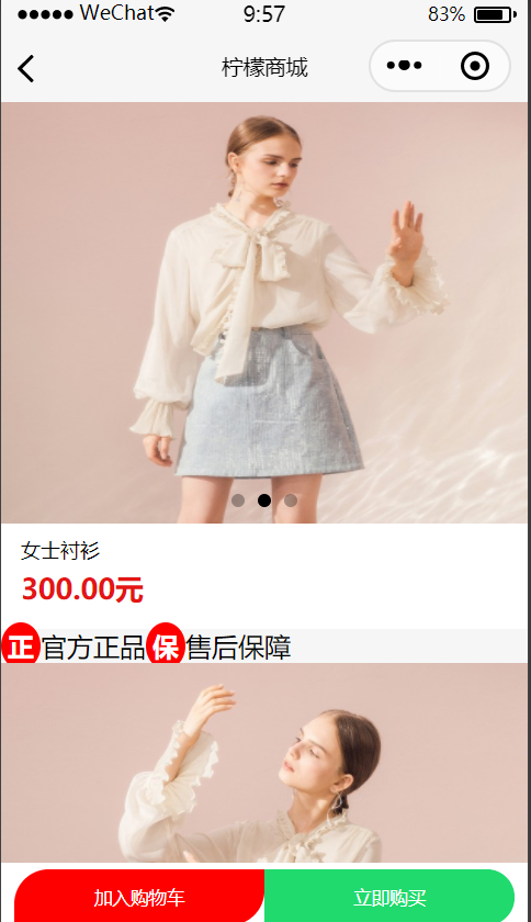 这是一款可以在微信上直接运行的商城。用户在输入用户名、密码成功登录后,即可进入商品页面。单击商品缩略图,就可进入到商品详情页面。在这个页面可以浏览到商品的具体细节,同时也可实现加入购物车的功能。