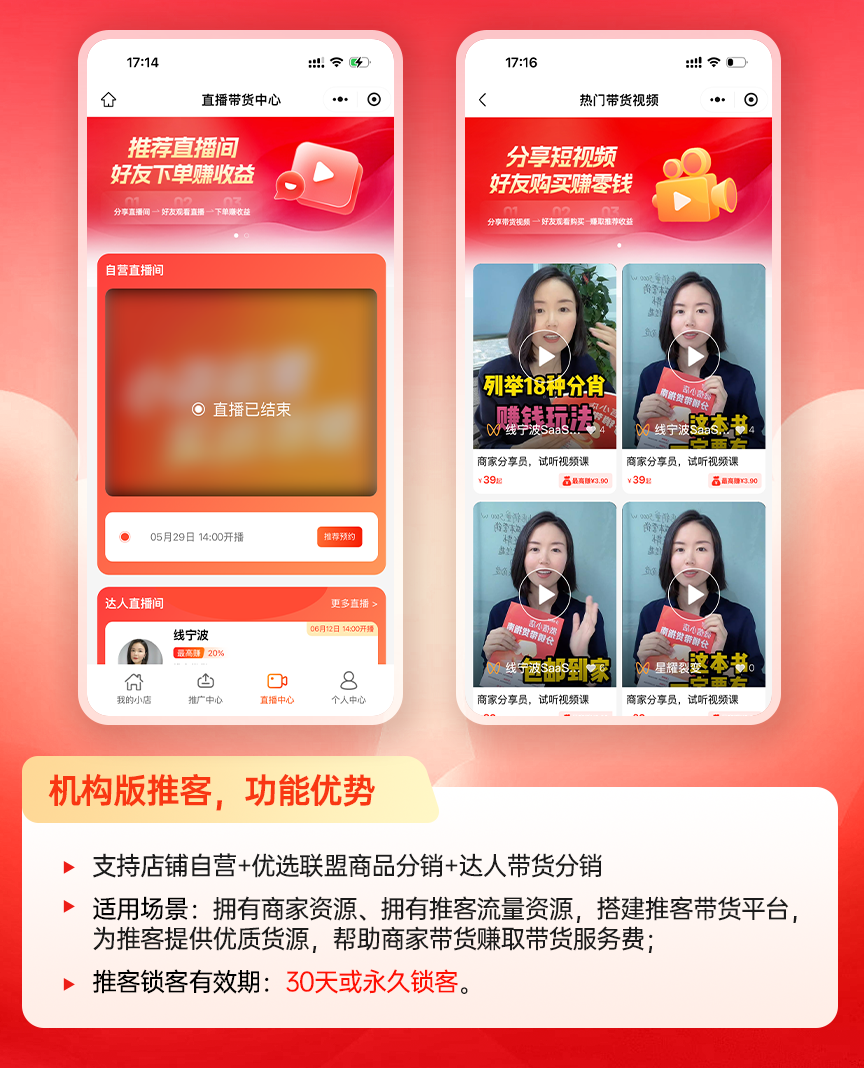有私域有供应链,核心是带第三方商家商品,搭建带货平台的,选择机构版推客;