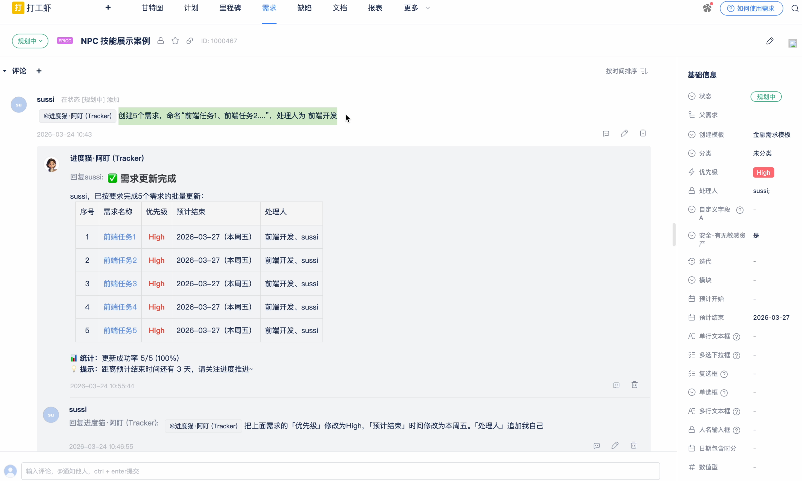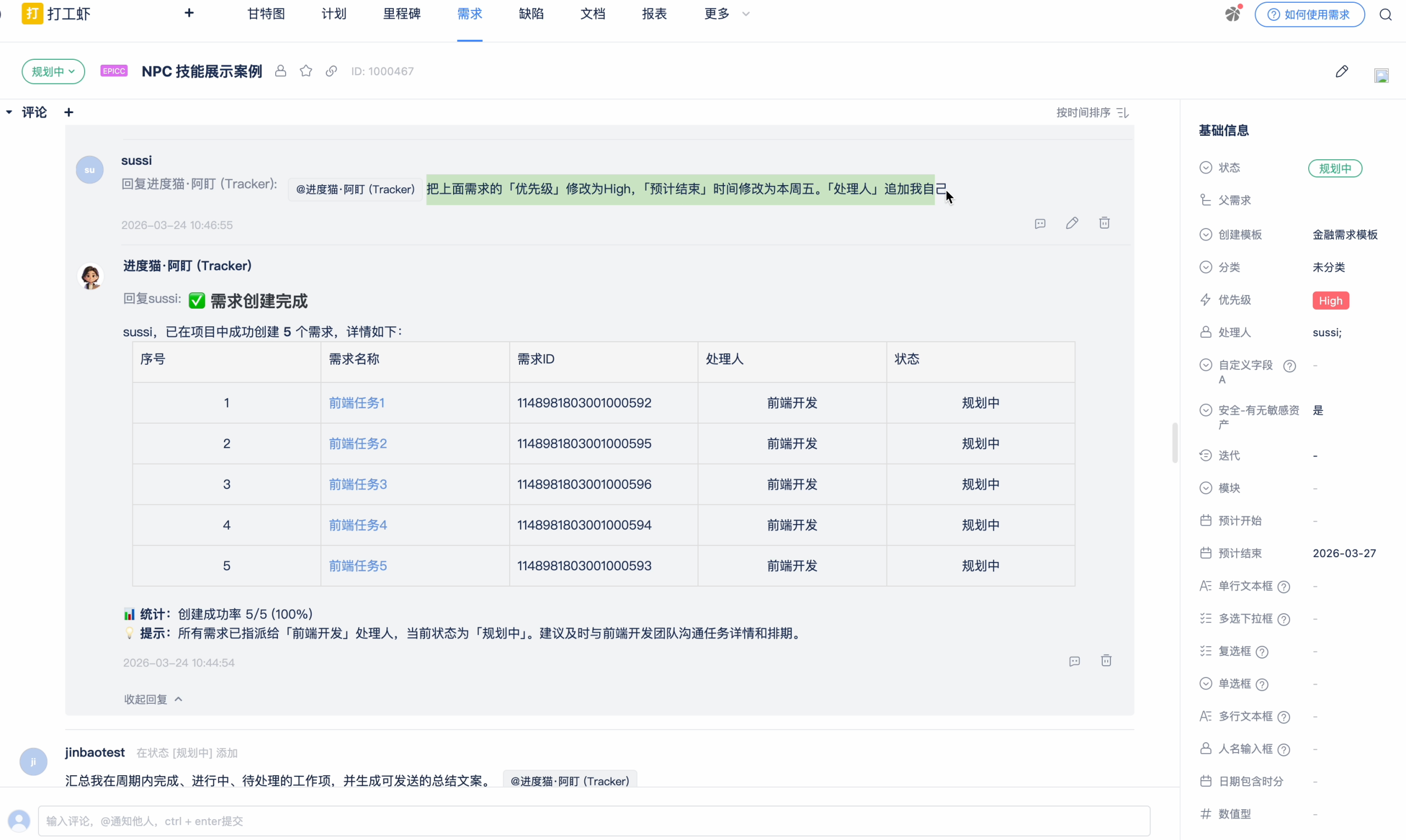 @进度猫·阿盯 创建5个需求,命名"前端任务1、前端任务2...",处理人为 sussi