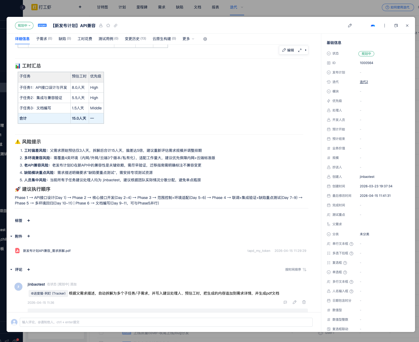 @智多星·小拓 根据父需求描述,自动拆解为多个子任务/子需求,并写入建议处理人、预估工时,把生成的内容追加到需求详情,并生成pdf文档