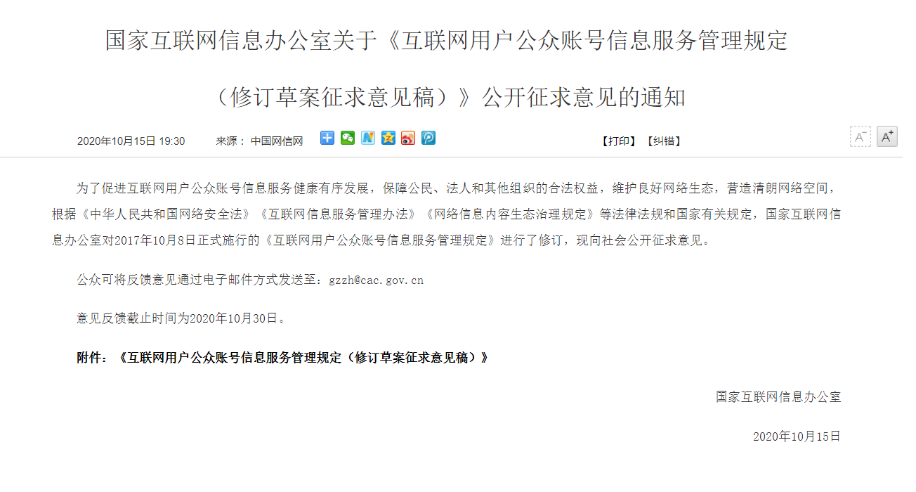 目前国家互联网信息办公室正在就“互联网用户公众账号信息服务管理规定”向全国人民征求意见,时间截止到10月30日。