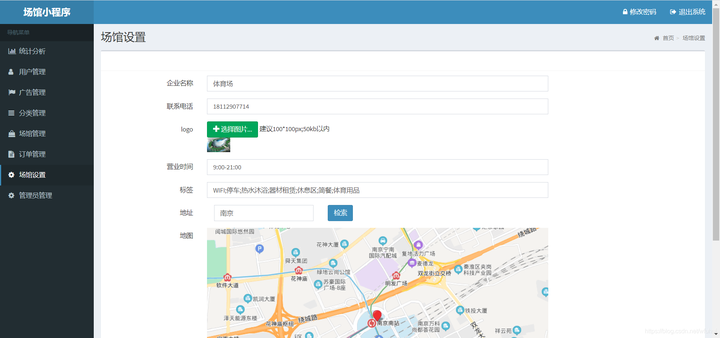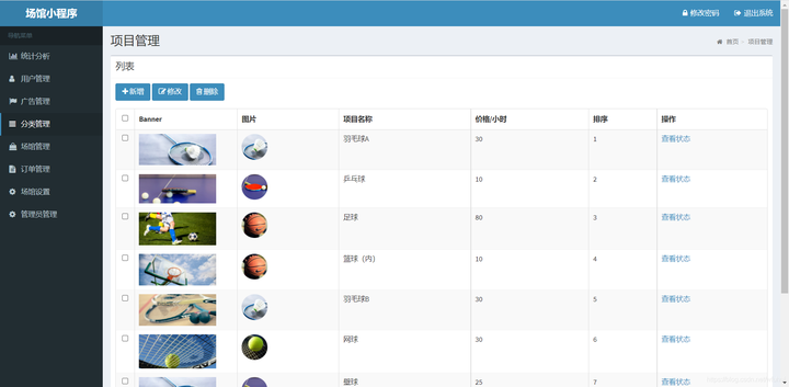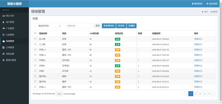 场地管理:场地的新增修改删除,以及查看场地得状态