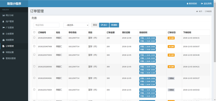 订单管理:用户下单信息得查看及删除