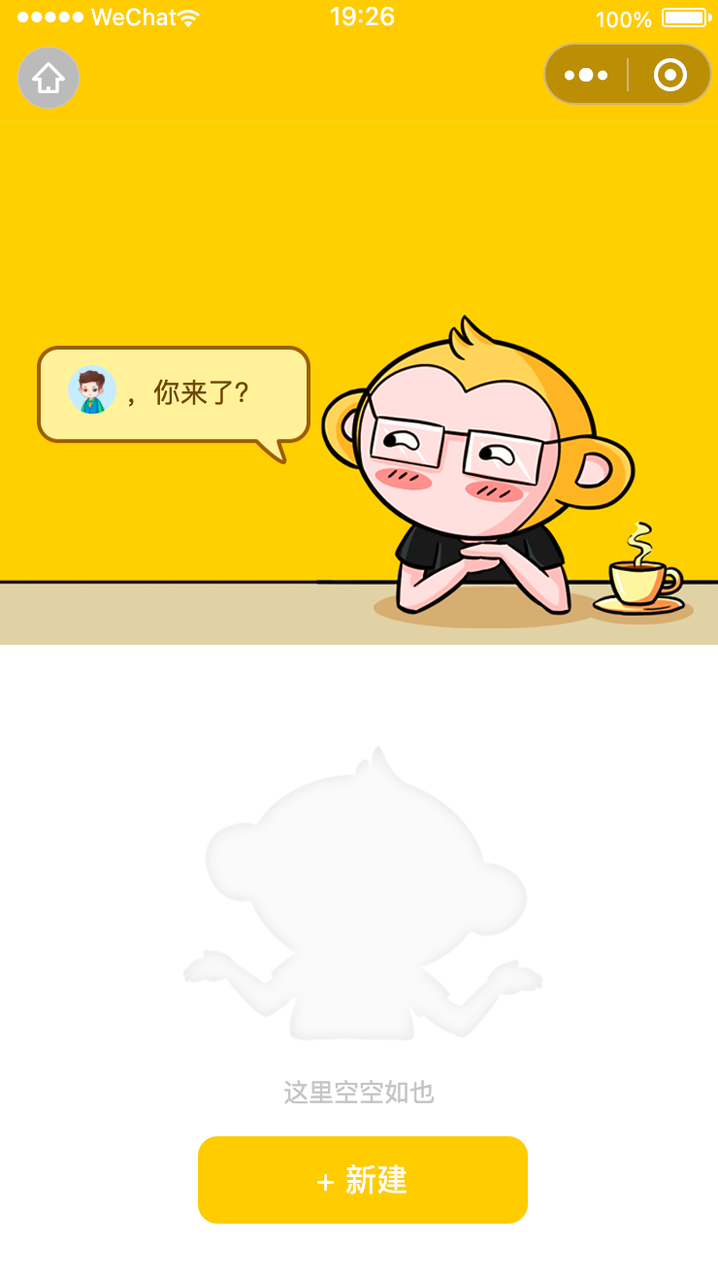 在继续向下分析头部:一个气泡然后里面有个头像和欢迎语,内容:没有数据的时候显示空布局提示还有新建按钮。然后把大概的布局结构写出来,我们得到这样的布局代码