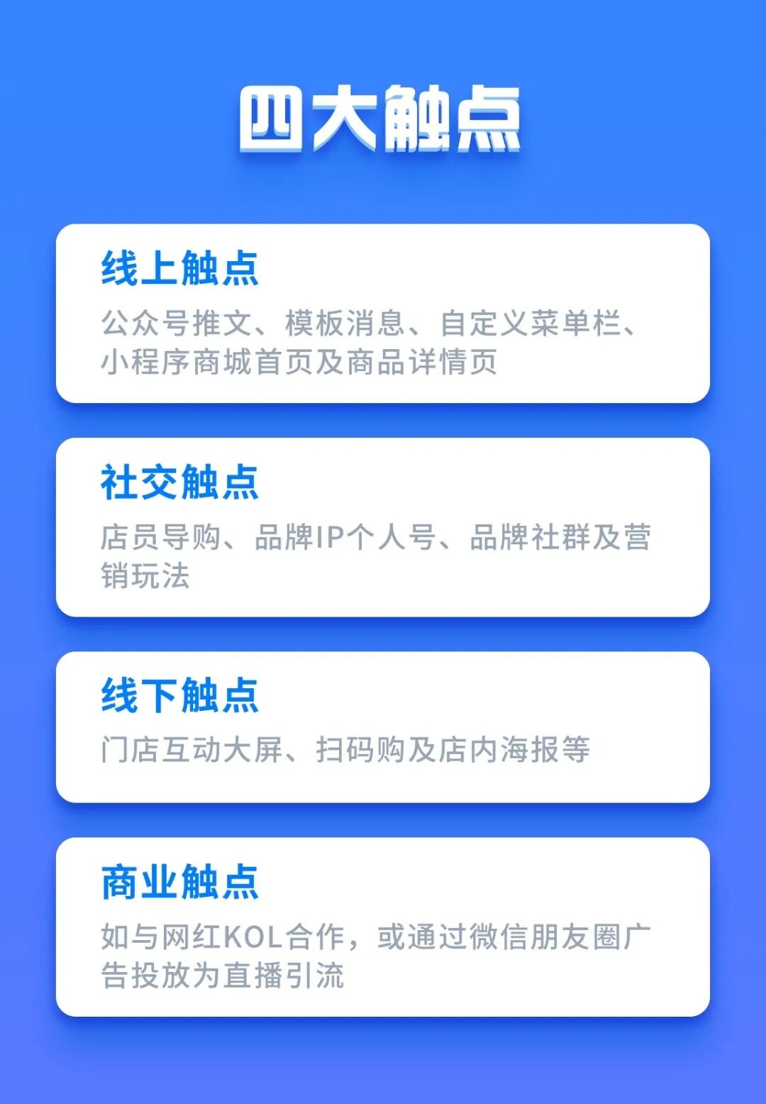 社交触点形式非常多样化,从与用户直连的门店导购、加盟商、品牌个人号到组合营销玩法,每一个触点都可以借力所在渠道特色方式为以后的直播预热,蓄积流量。