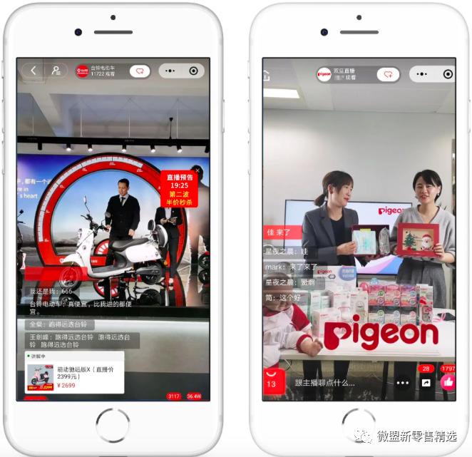 商户可以使用微盟直播小程序创建直播间实现直达购买,并结合微盟提供的丰富营销玩法快速拉新获客,梦洁家纺、珀莱雅、台铃电动车等便是借助微盟直播小程序快速提升销量。