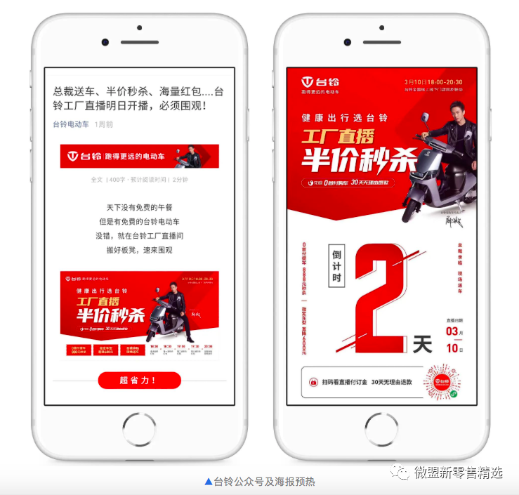 台铃电动车在3月10号工厂直播首秀中,将原价1688元的电动车,在当晚18:55分以888元限时秒杀的形式推出,让现场用户直享直播福利,刺激购买需求提高销量。