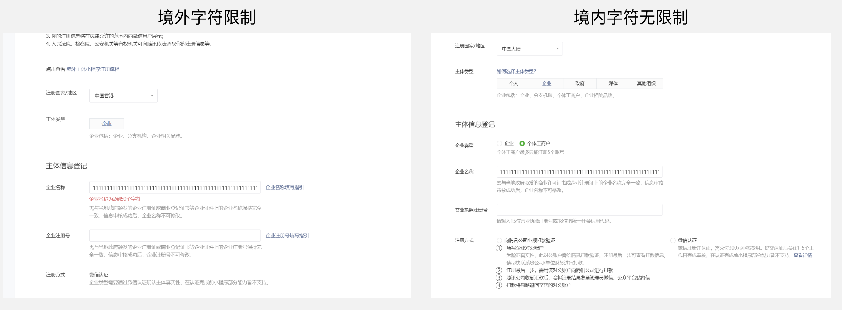 境内字符限制:境内选择个体工商户和企业没有字符限制
