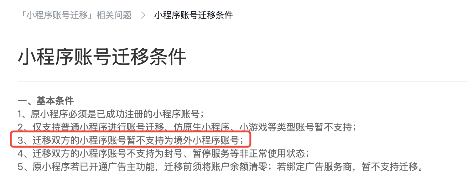 由于迁移双方的小程序账号不支持境外主体小程序,因此暂时无法进行迁移
