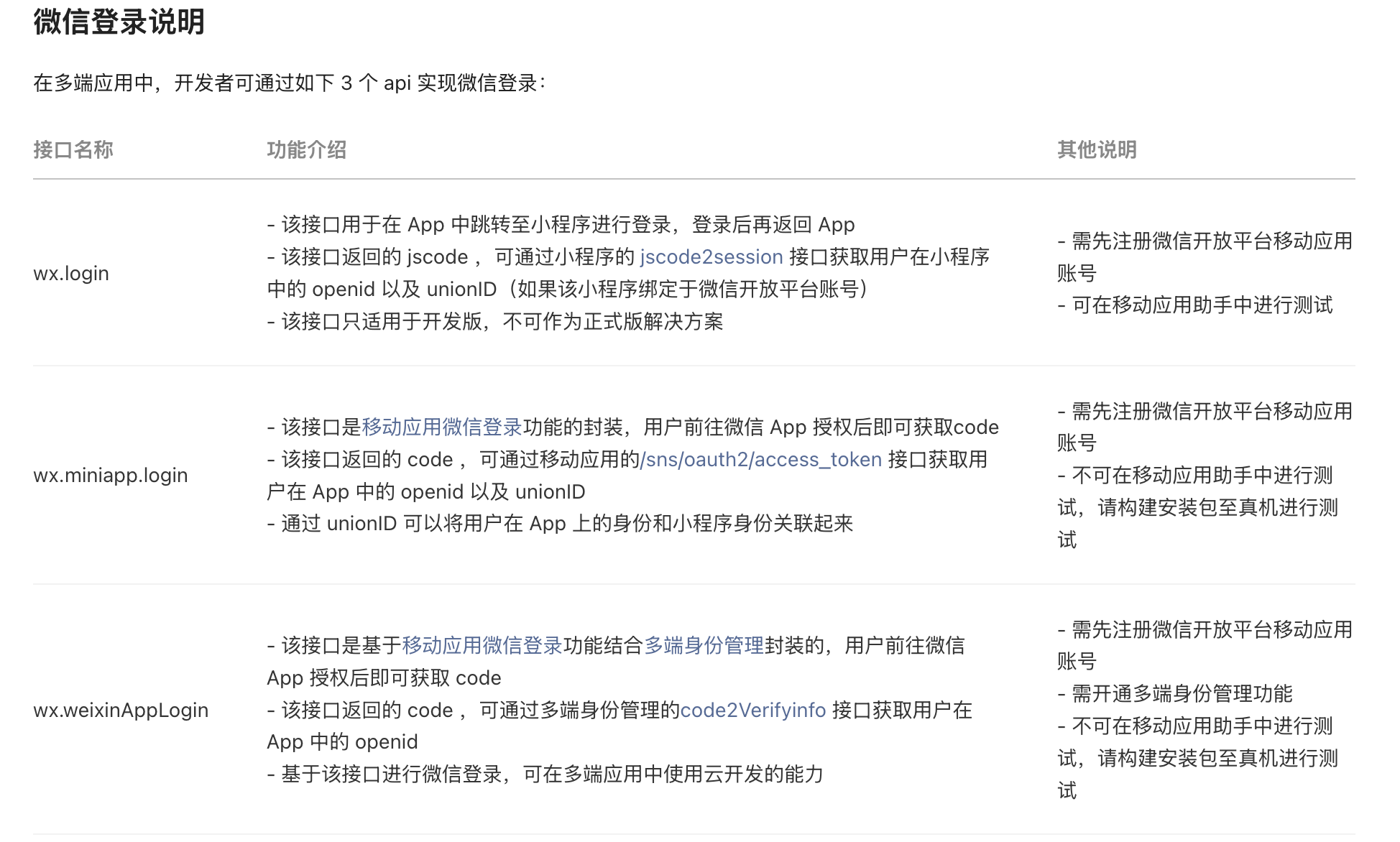 微信登录接口需要开发者先注册微信开放平台移动应用账号才能申请,在多端应用中,开发者可通过 3 个 api 实现微信登录。